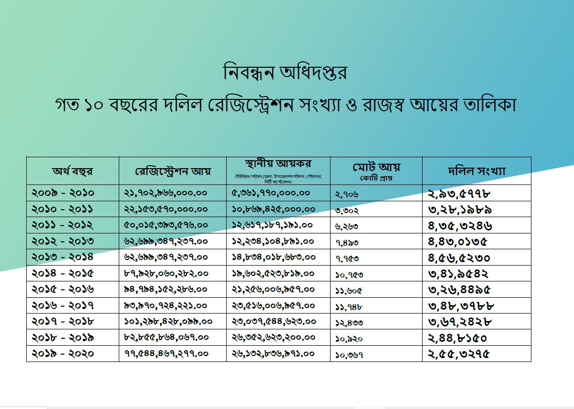 ১০ বছররর দলিল সংখ্যা ও রাজস্ব আয়ের তালিকা